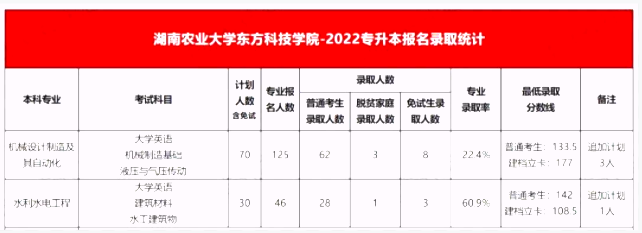 2022年湖南农业大学东方科技学院专升本共计实际招生专业人数105人,其中机械专业最低分133分,水利水电工程最低分142分,这个相对同学们分数线还是比较低的,各位同学如果想要报考该院校,可以根据自己情况报名!