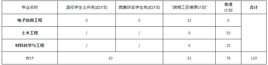 2022年湖南科技大学专升本招生计划共计招生120人(含免试),招生专业为电子信息工程、土木工程、材料科学与工程。