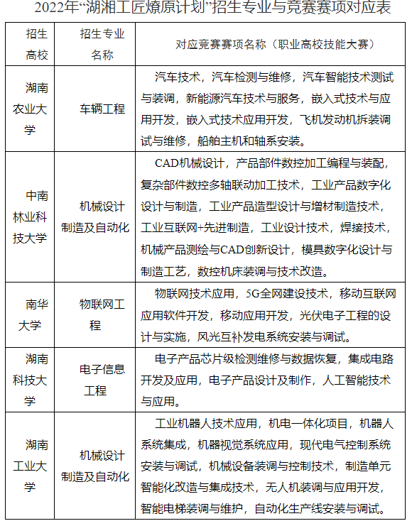 2022年“湖湘工匠燎原计划”招生专业与竞赛赛项对应表